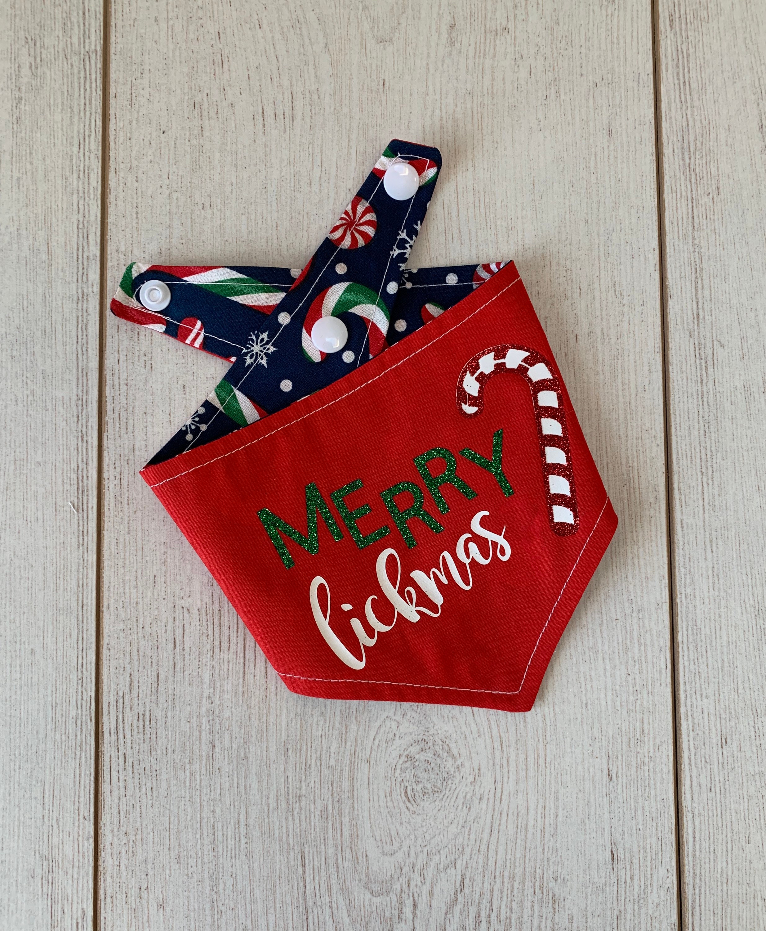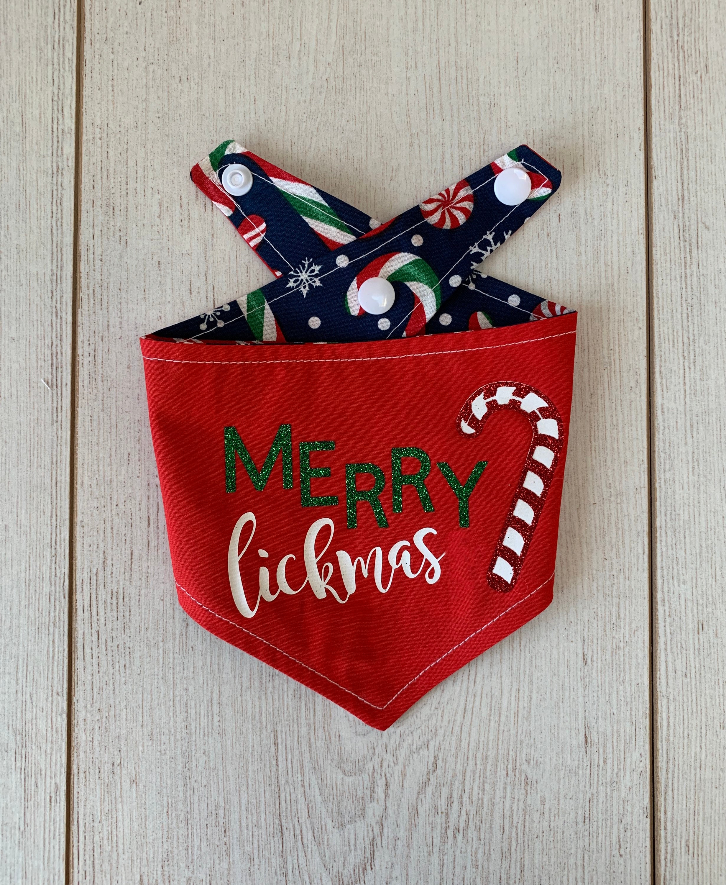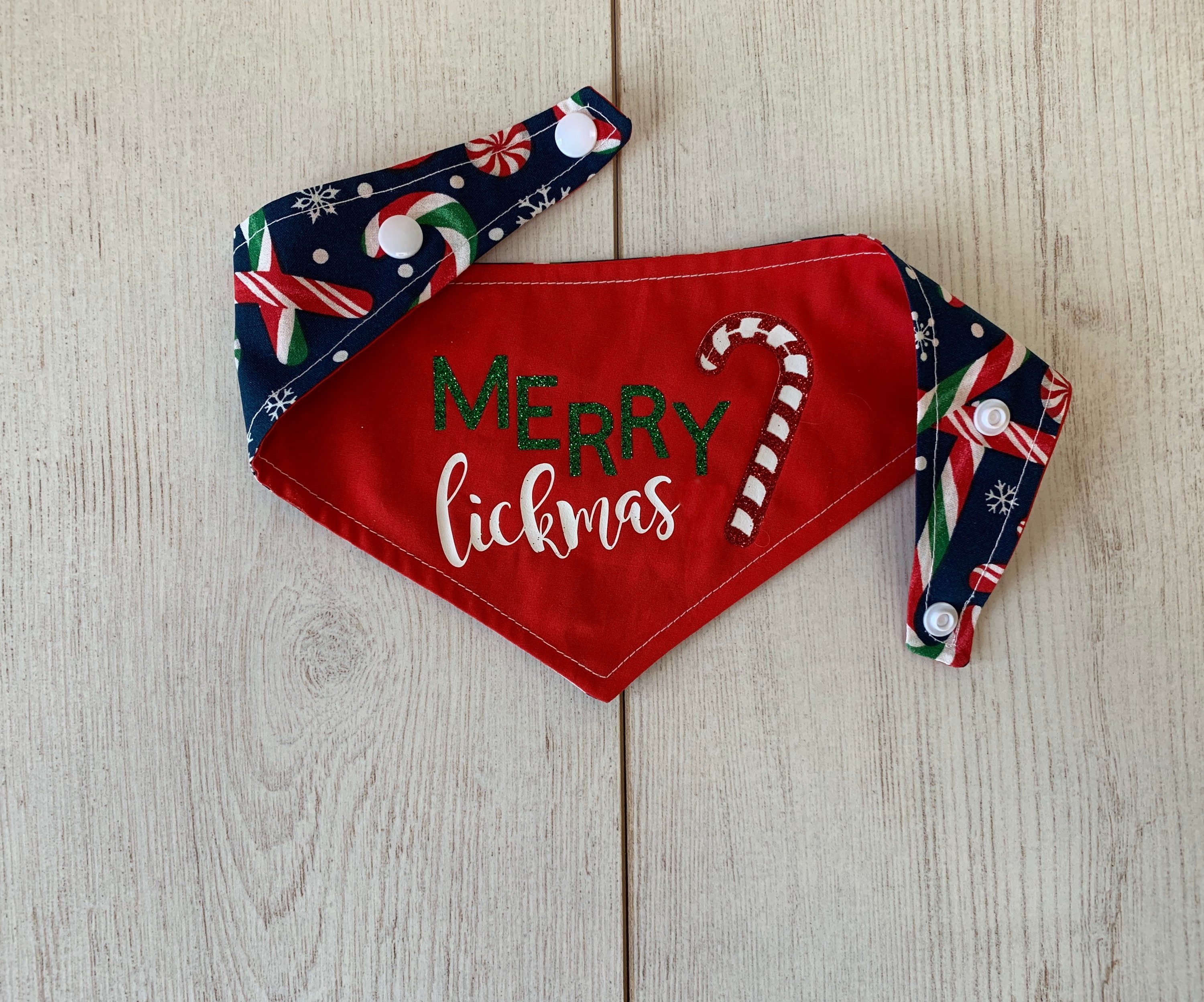Merry Lickmas Christmas dog Bandana. A Merry Lickmas vinyl print with in glitter vinyl with a gorgeous glitter candy cane on a Christmassy bright red fabric, teamed with a fabulous Candy Cane fabric in a deep blue. This Bandana would make the perfect gift for any dog this Christmas and a fabulous way to wish a Merry Christmas to those you love.