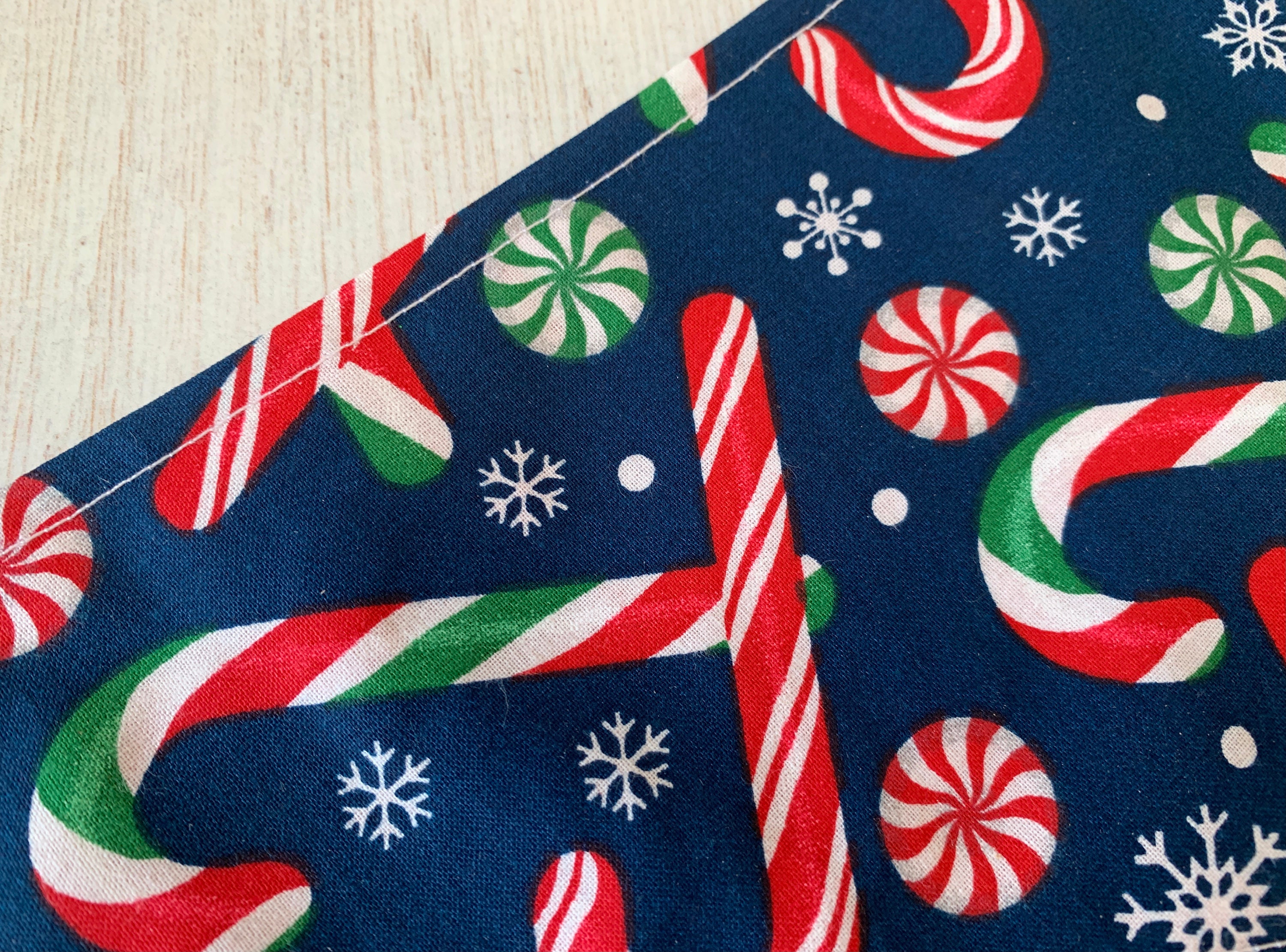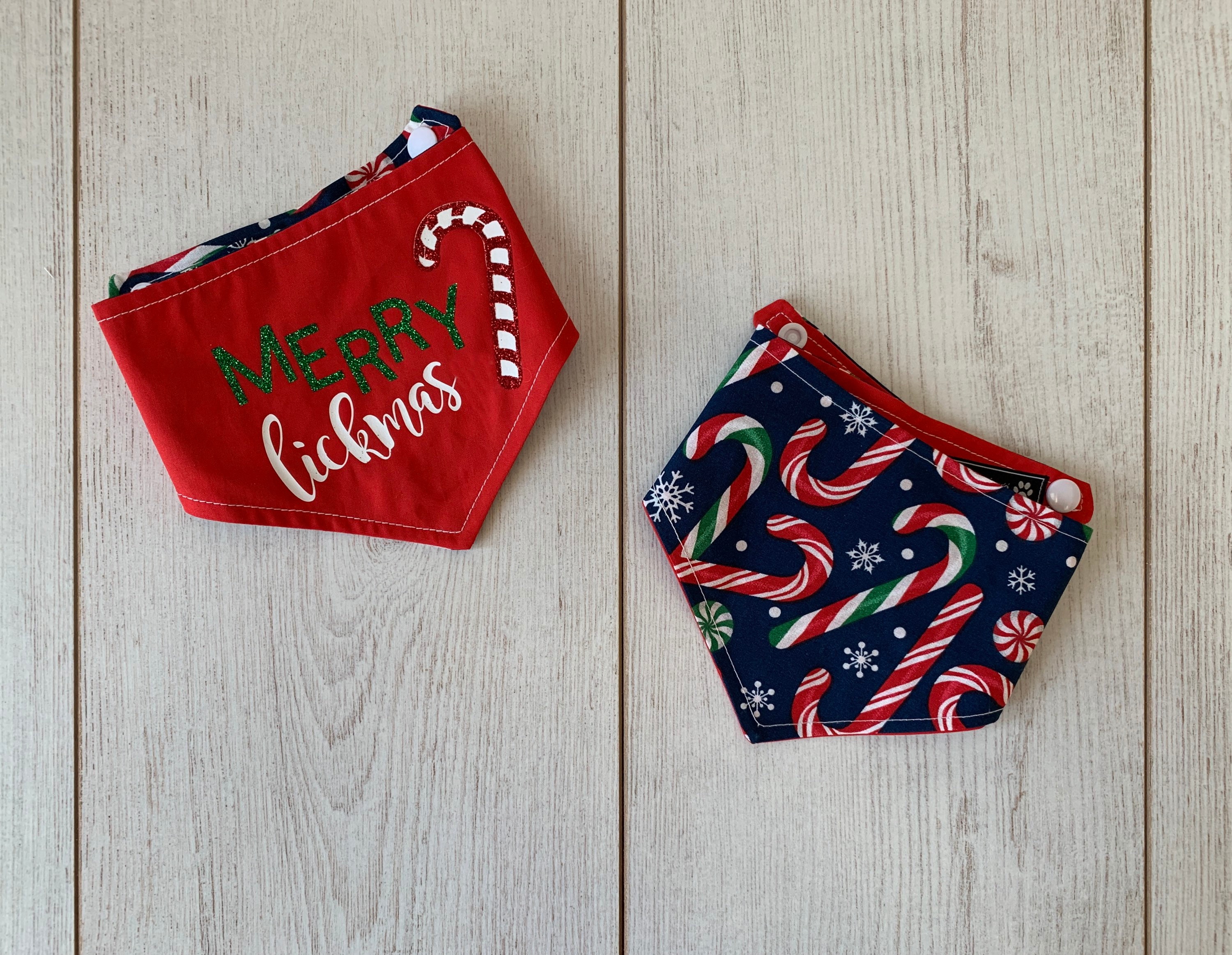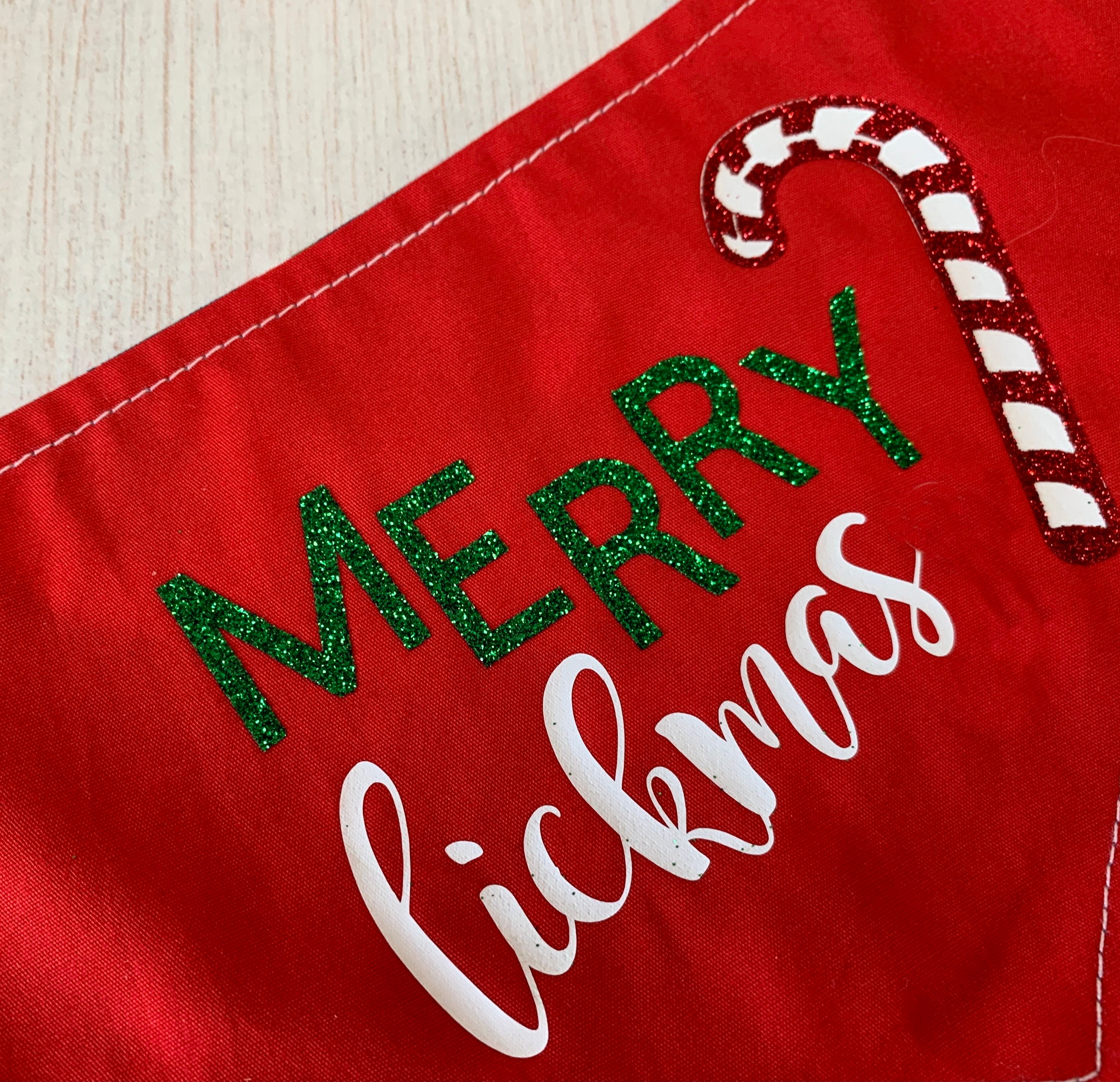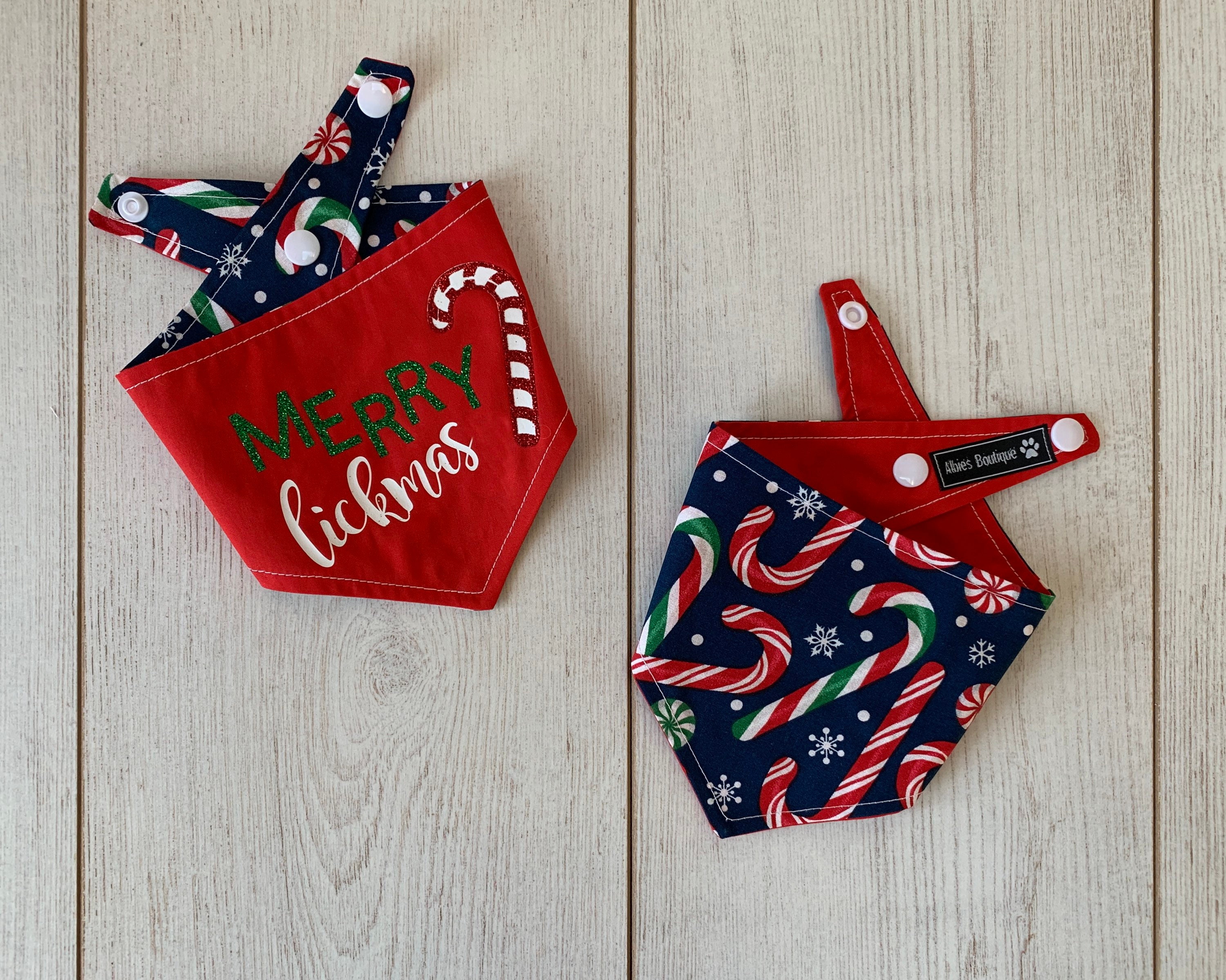 Merry Lickmas Christmas dog Bandana. A Merry Lickmas vinyl print with in glitter vinyl with a gorgeous glitter candy cane on a Christmassy bright red fabric, teamed with a fabulous Candy Cane fabric in a deep blue. This Bandana would make the perfect gift for any dog this Christmas and a fabulous way to wish a Merry Christmas to those you love.
