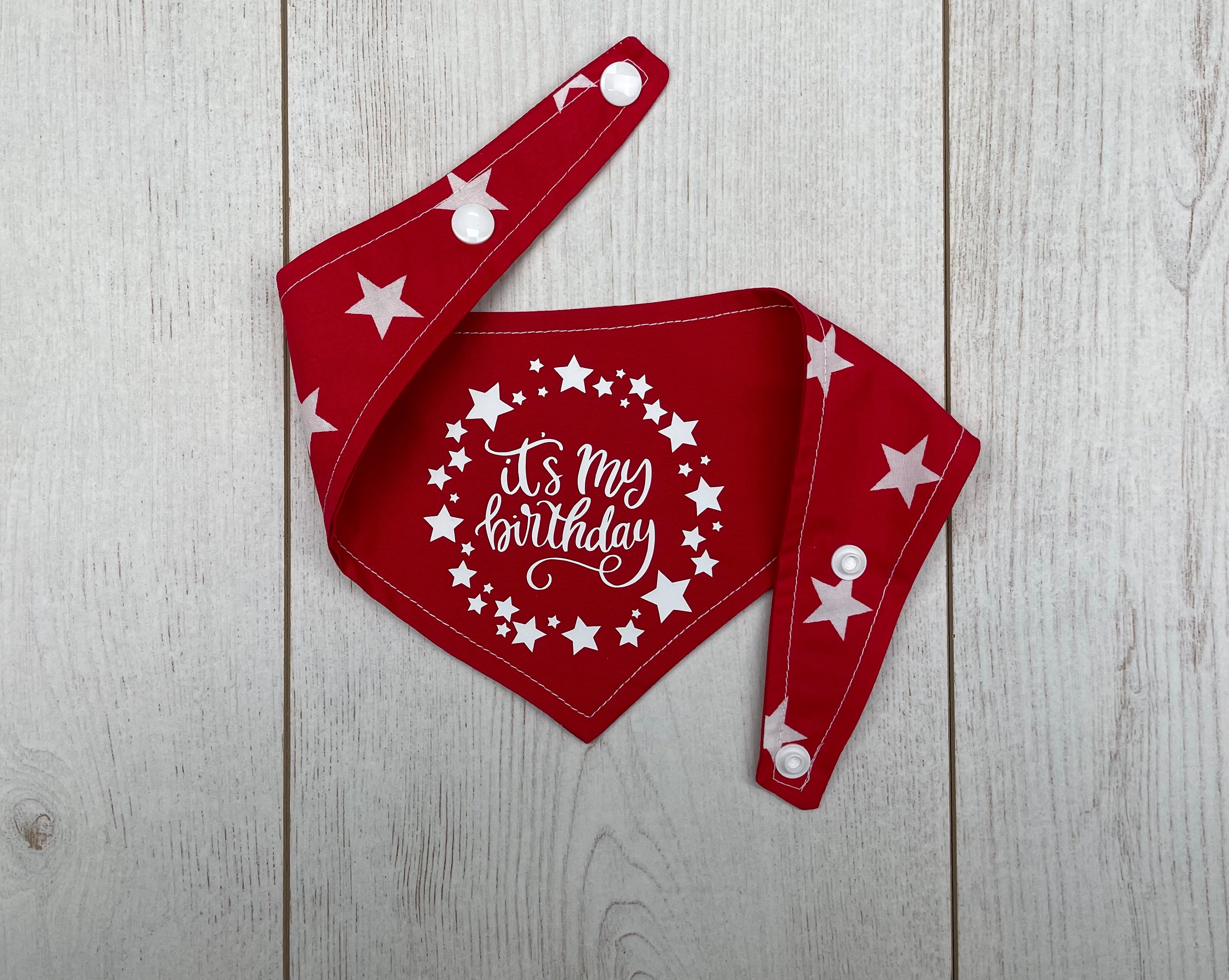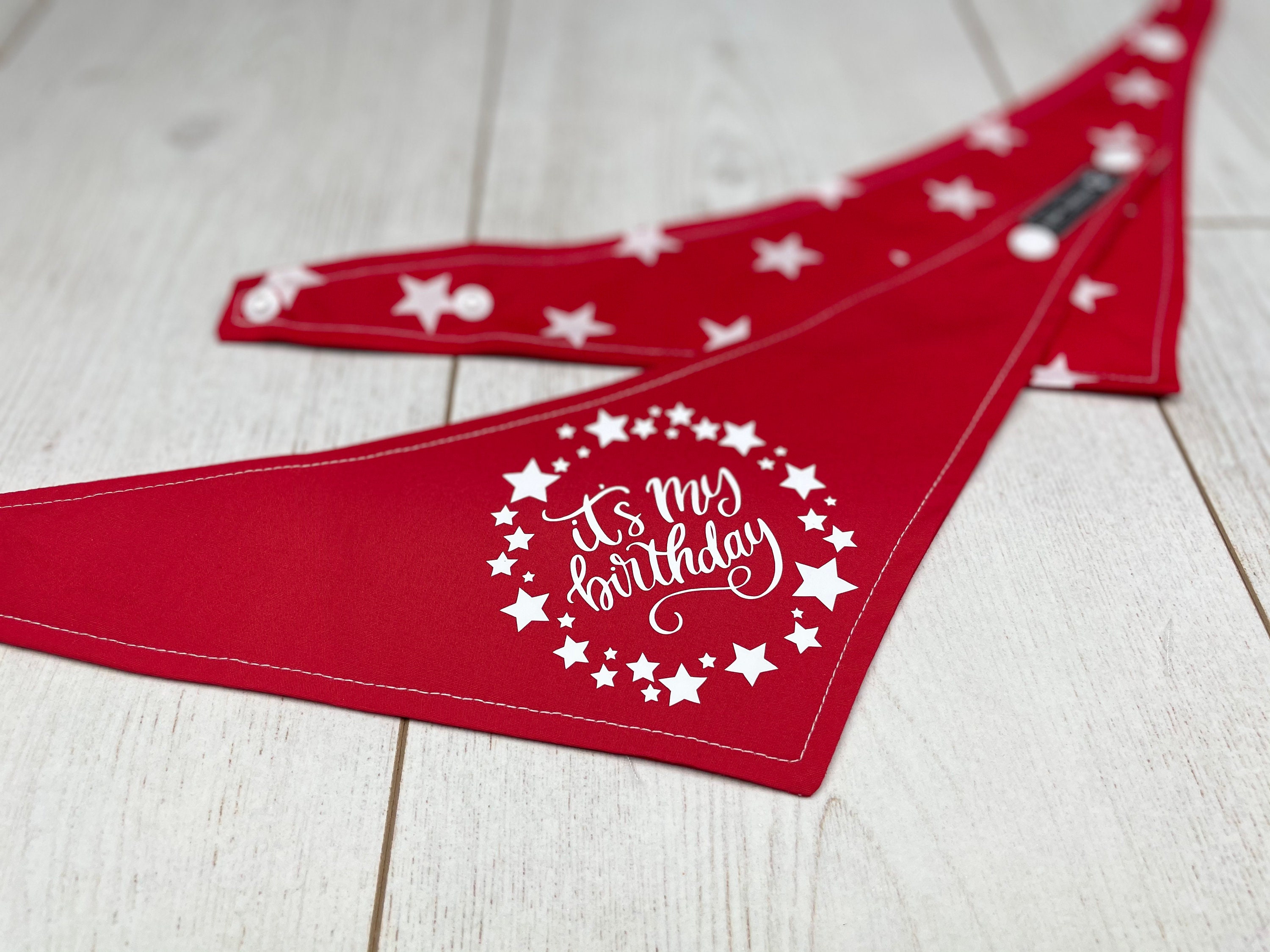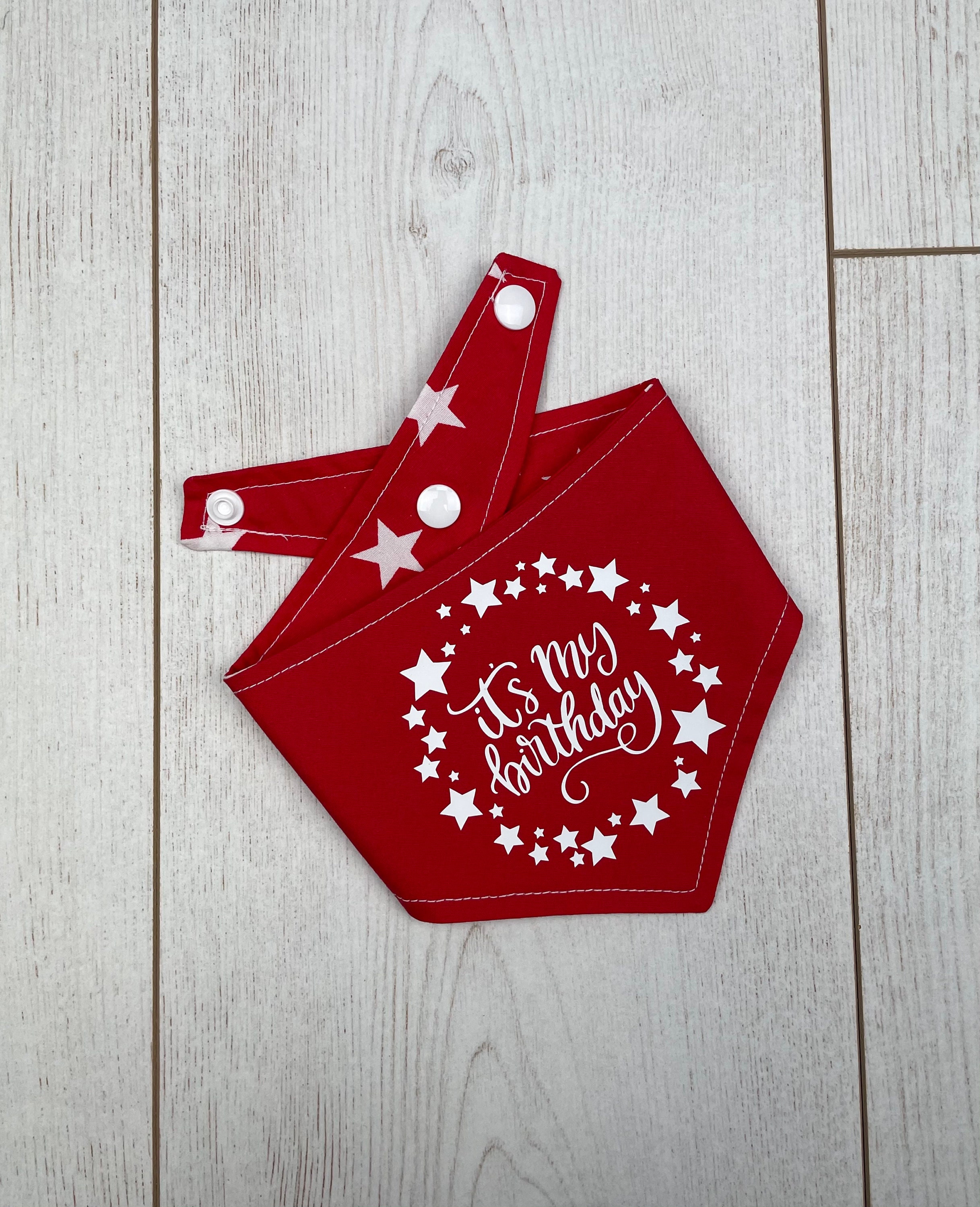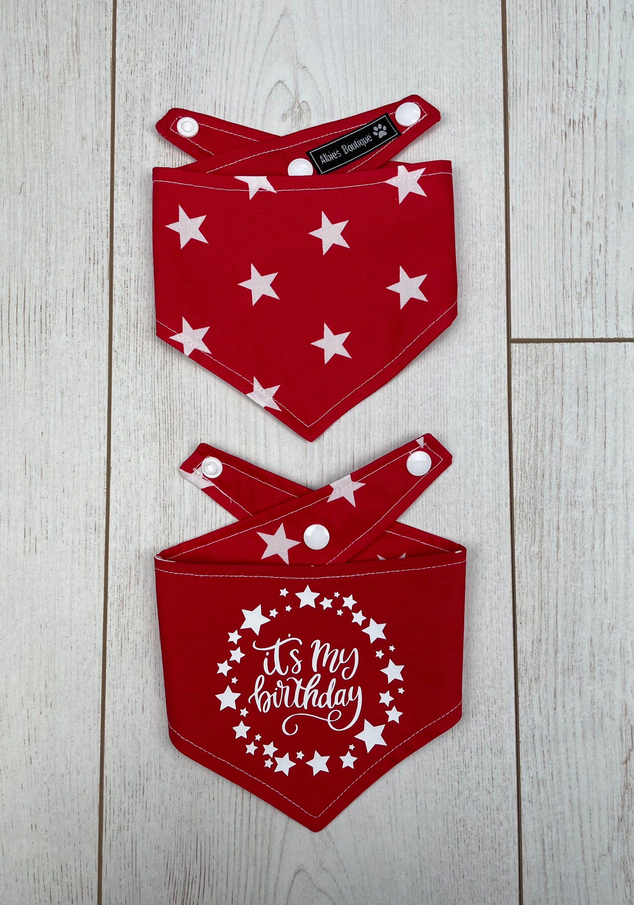 Handmade double sided dog bandana with in a Bright Red fabric with a ‘It’s my Birthday ’ vinyl print on one side and a red and white Star fabric on the other. The bandana’s are secured by a popper fastening. There is an option to either add a name to the reverse or to request a change to the text on the front.