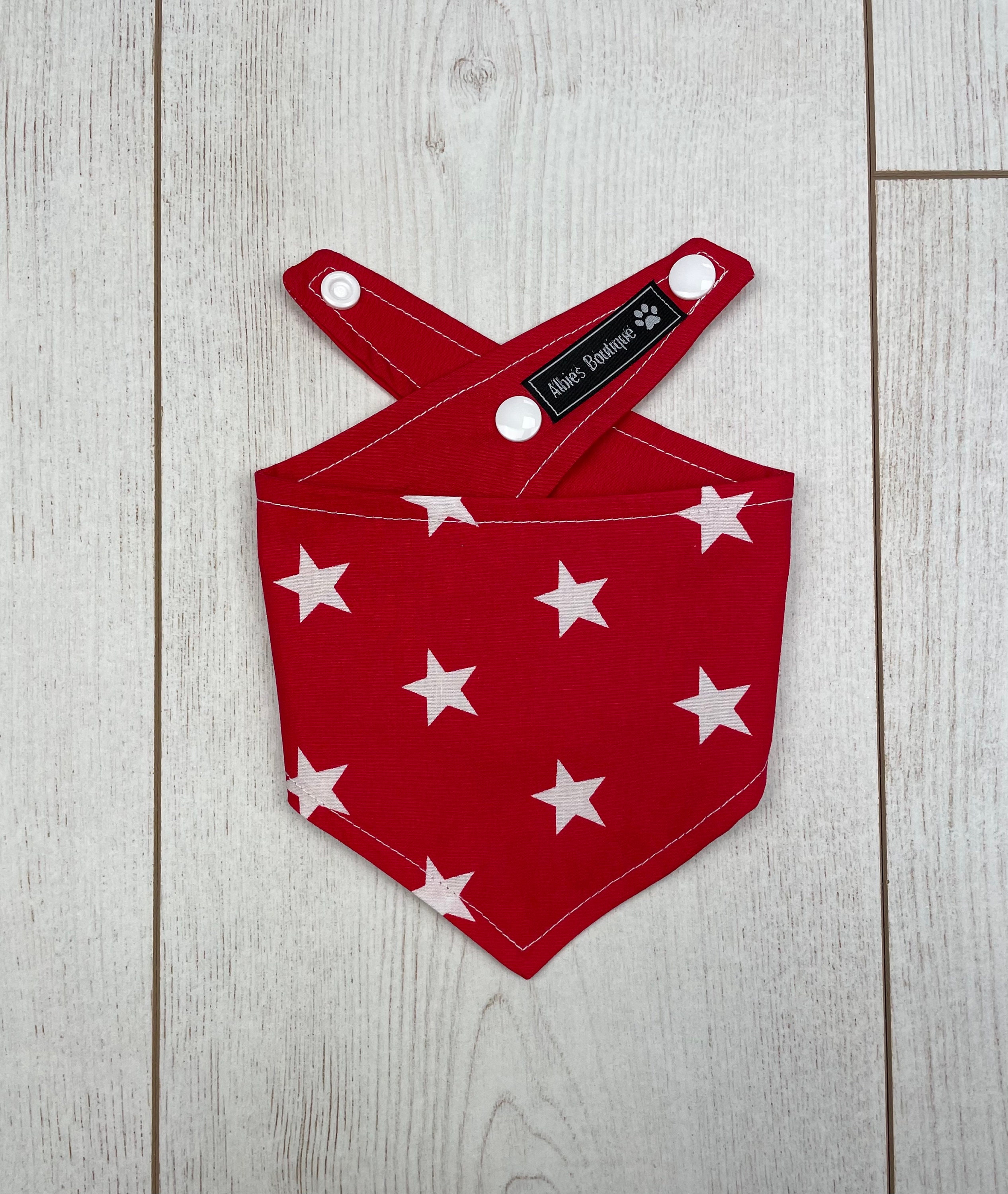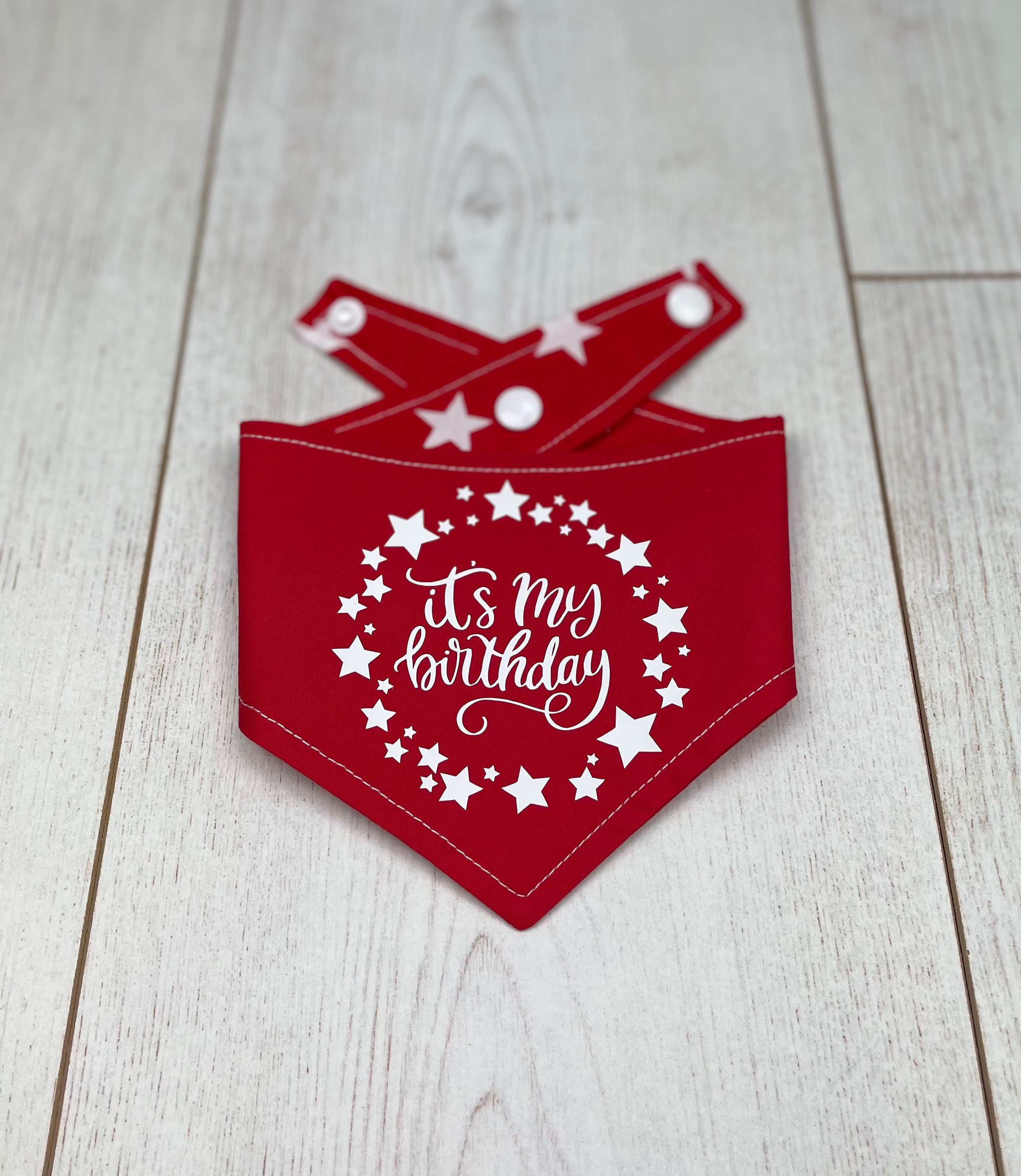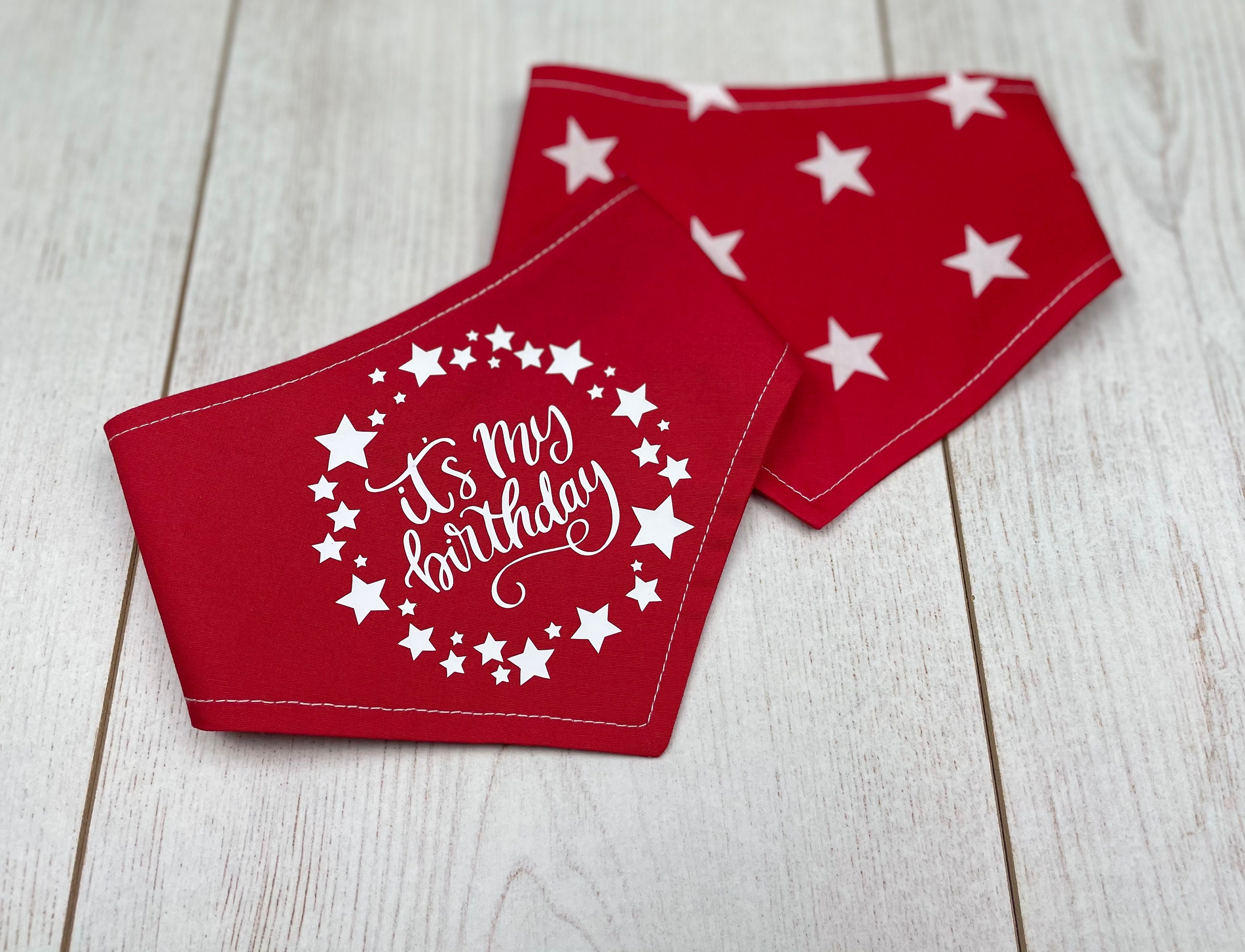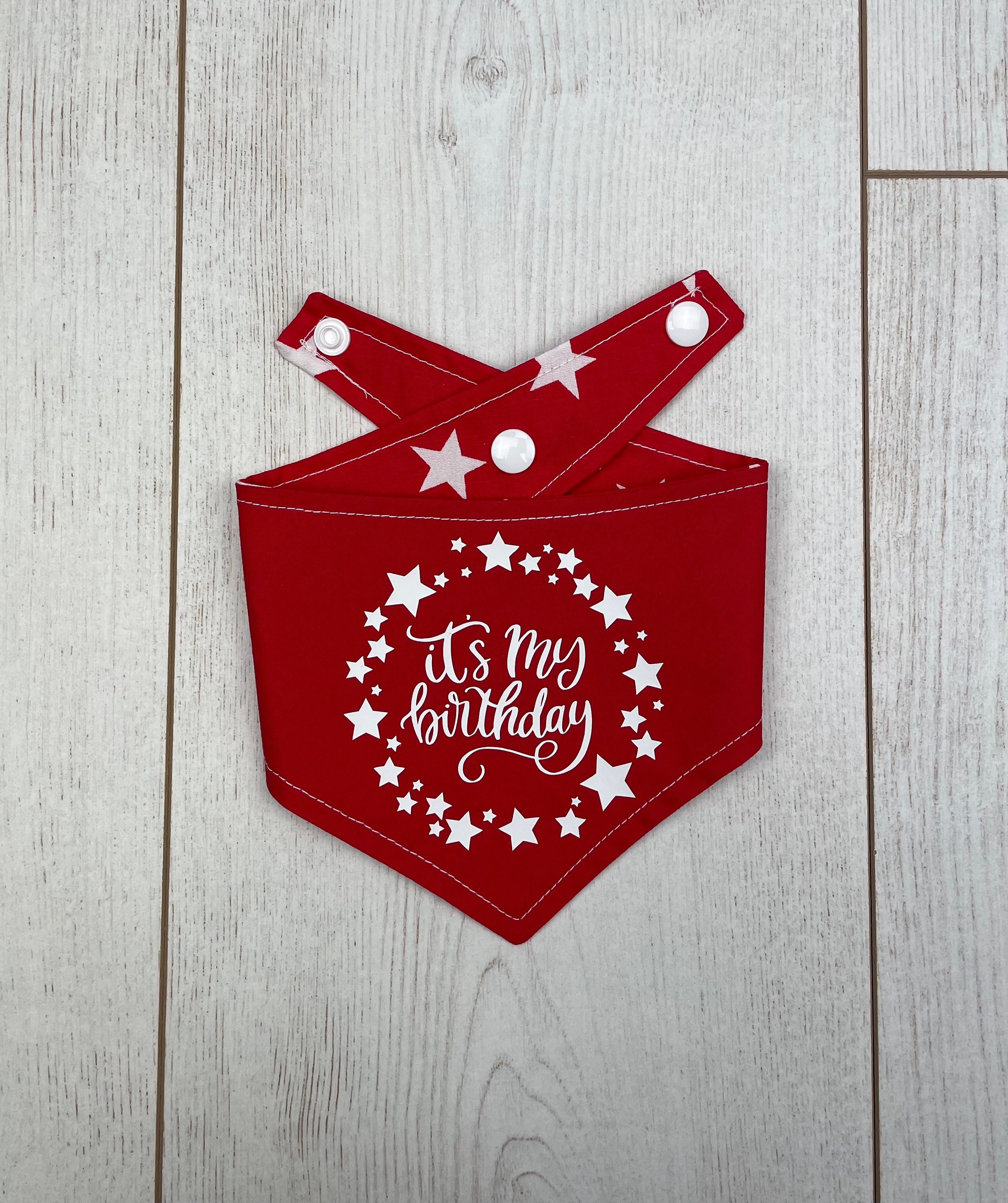 Handmade double sided dog bandana with in a Bright Red fabric with a ‘It’s my Birthday ’ vinyl print on one side and a red and white Star fabric on the other. The bandana’s are secured by a popper fastening. There is an option to either add a name to the reverse or to request a change to the text on the front.