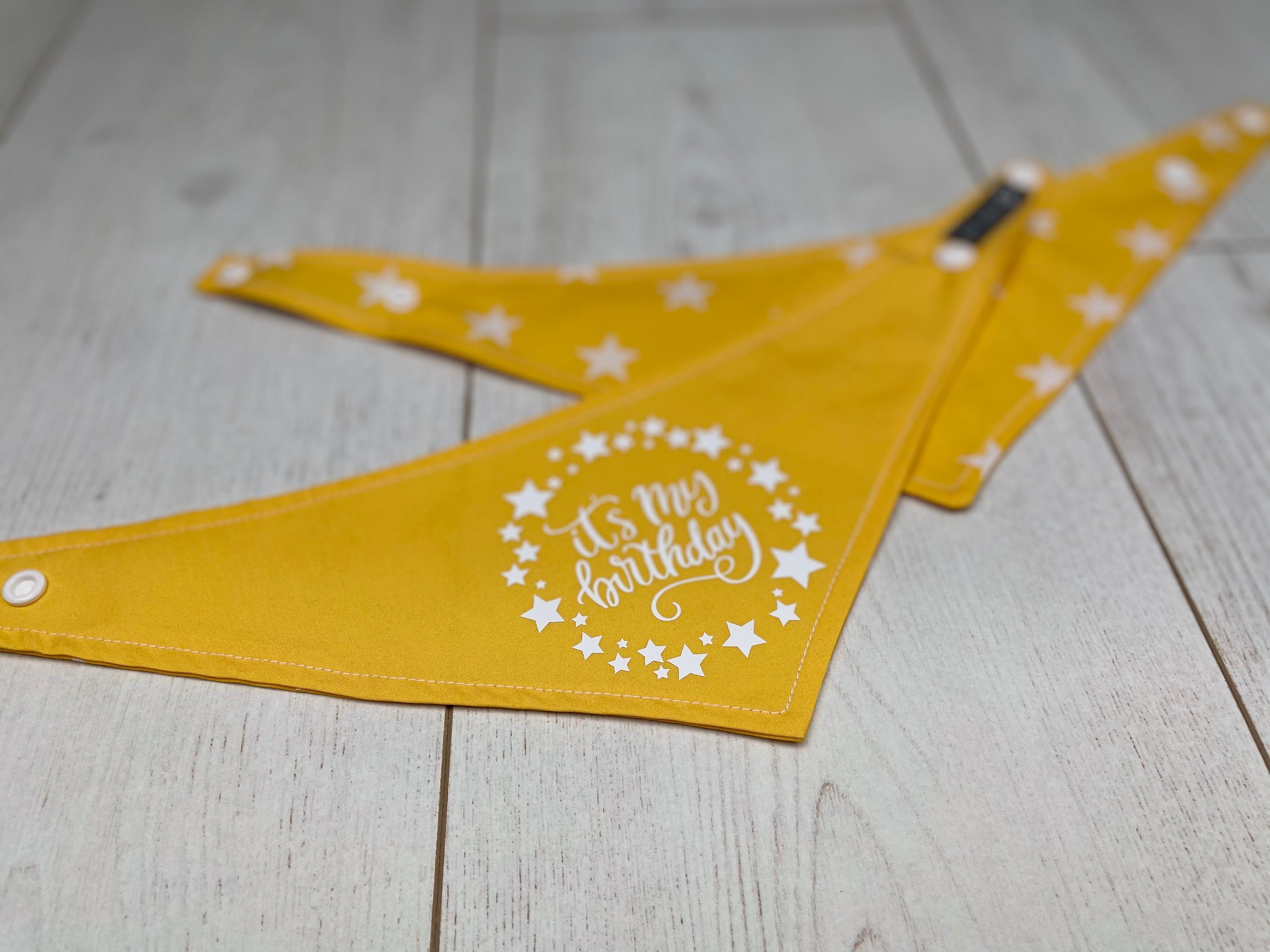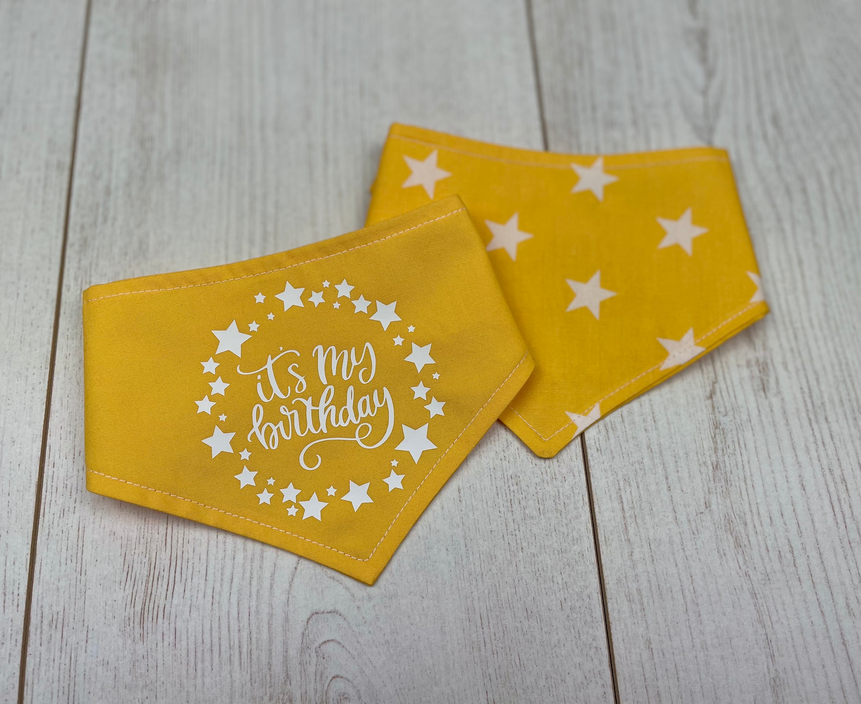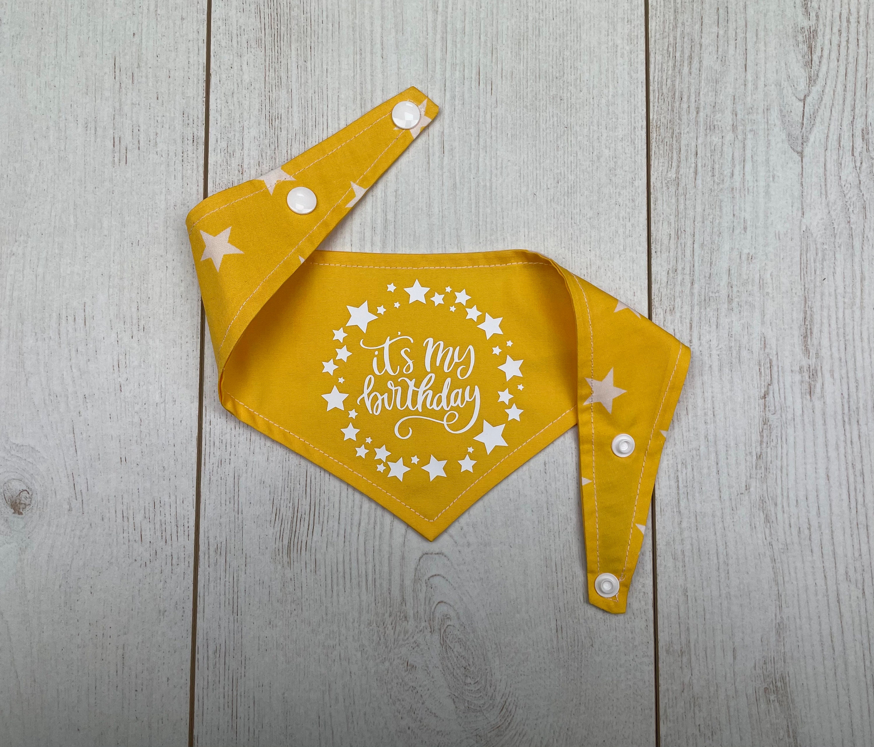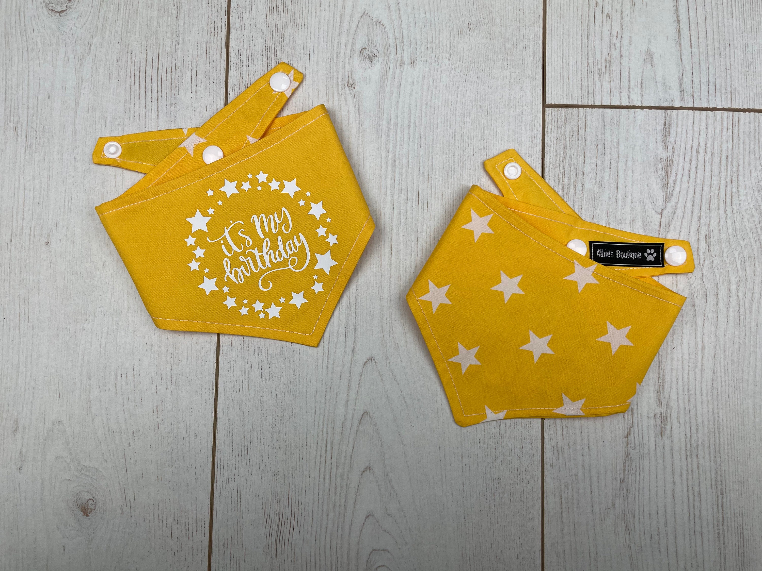 Handmade double sided dog bandana in a Bright Yellow fabric with a ‘It’s my Birthday ’ vinyl print on one side and a yellow and white Star fabric on the other. The bandana’s are secured by a popper fastening. There is an option to either add a name to the reverse or to request a change to the text on the front. This design is also available in a bright red version.
