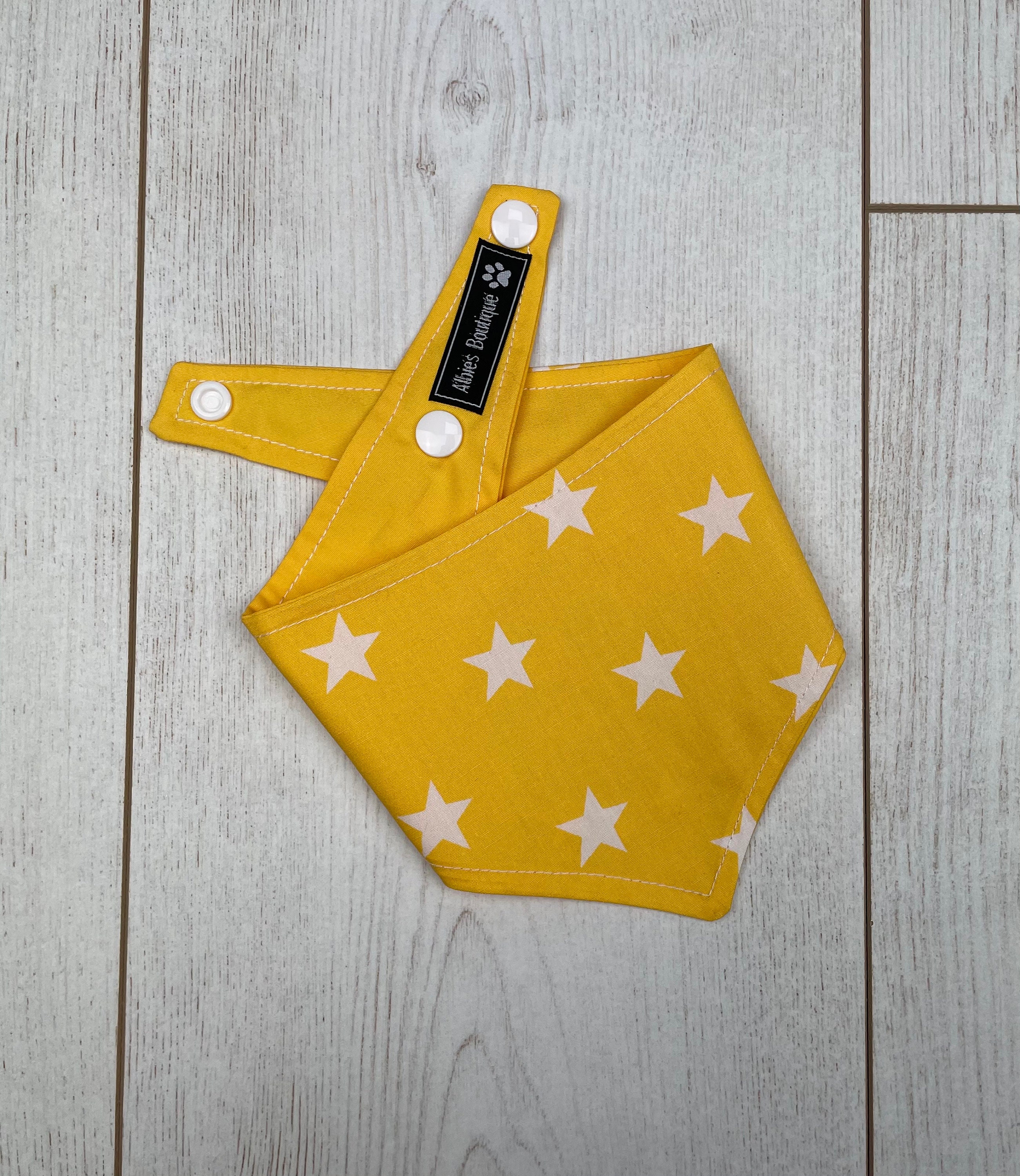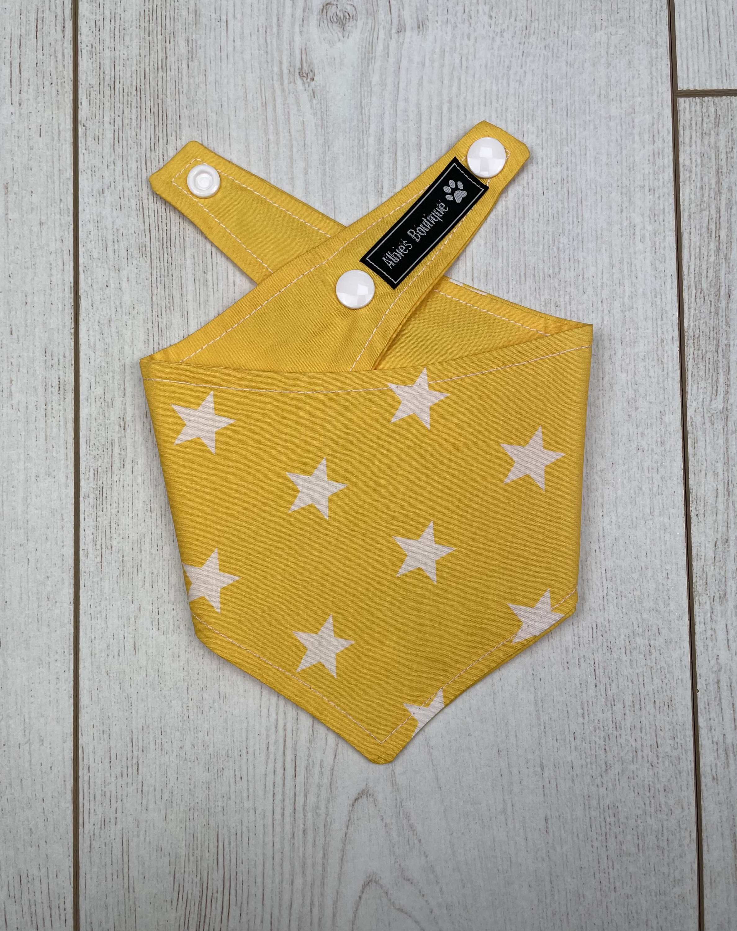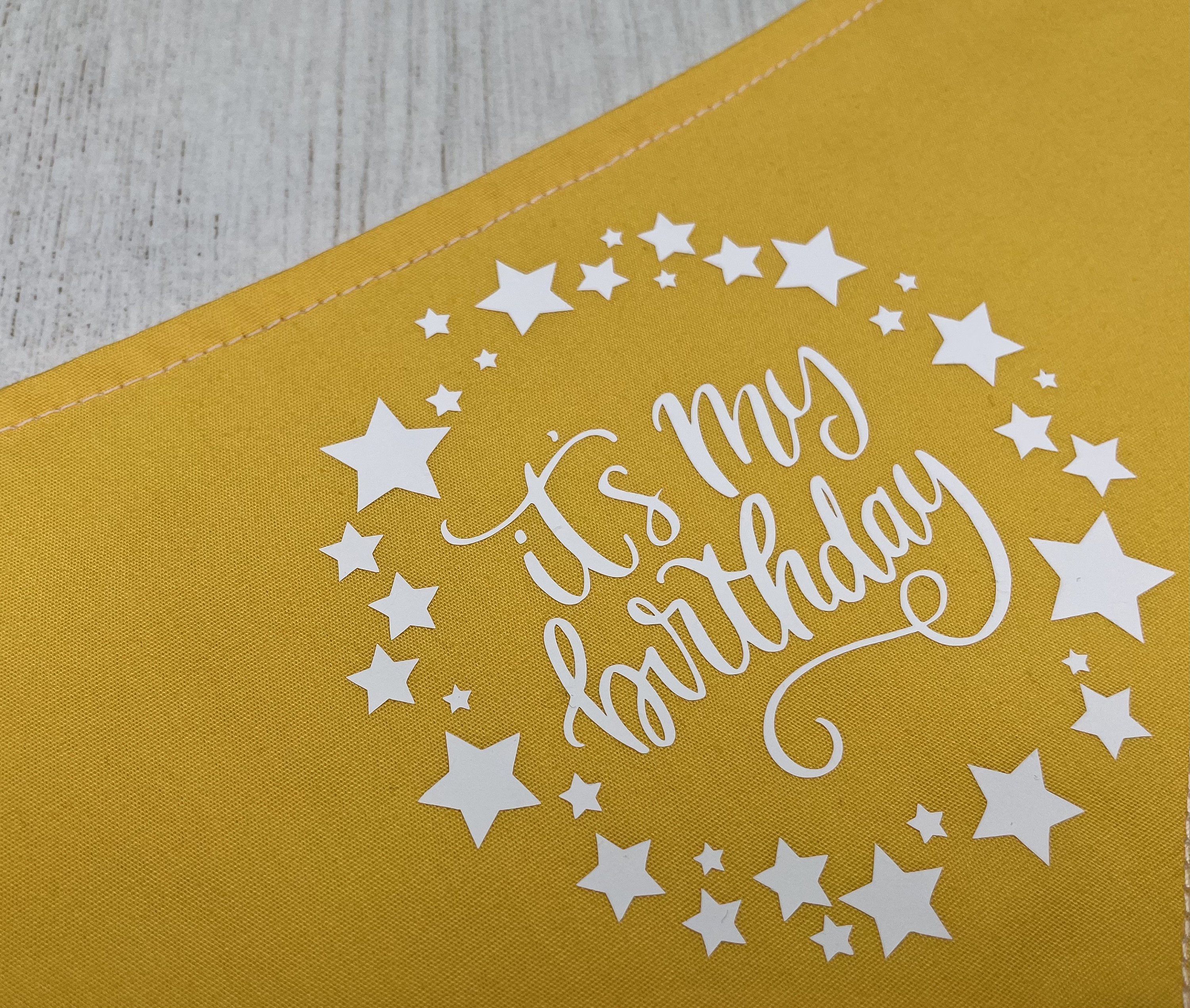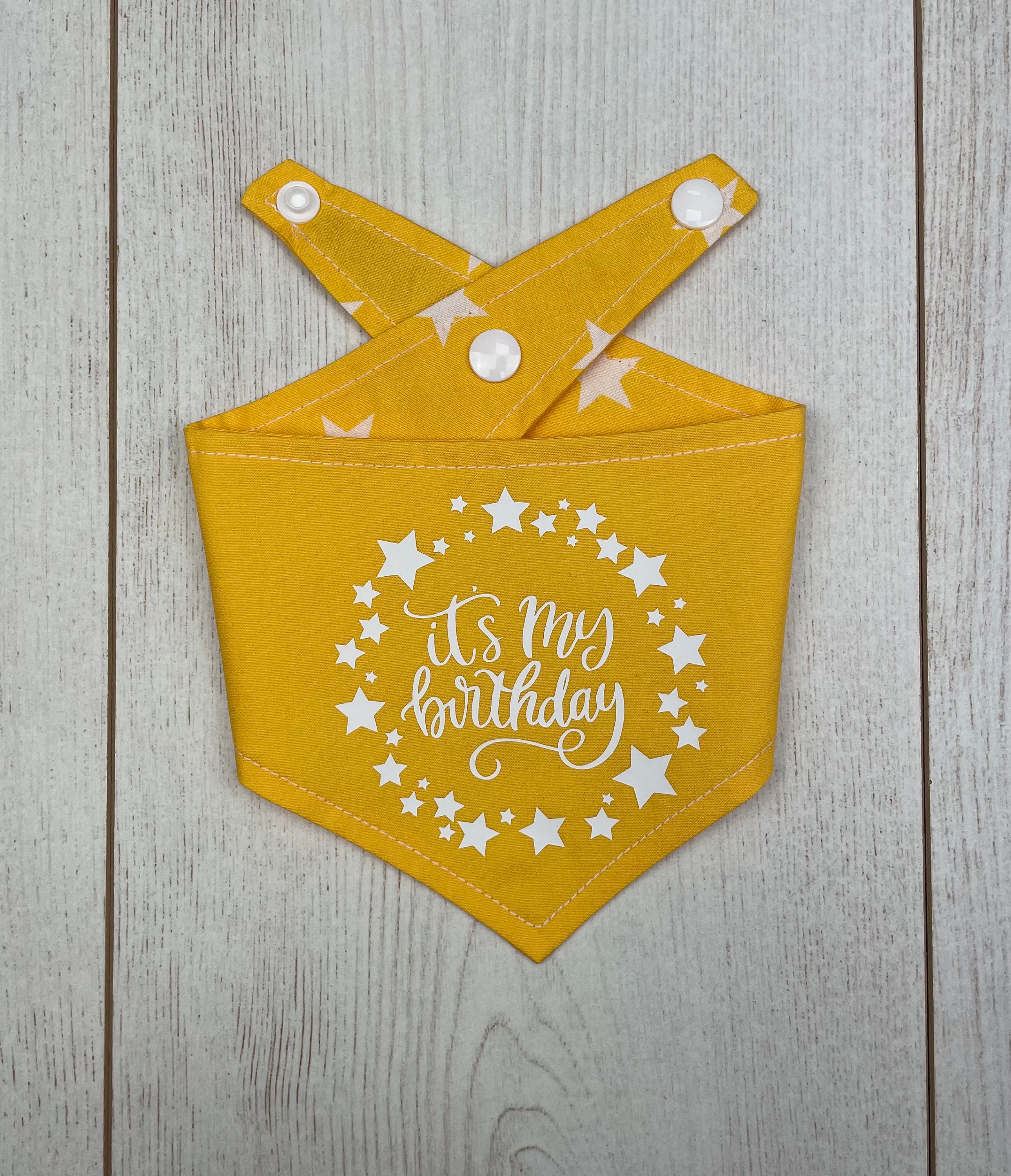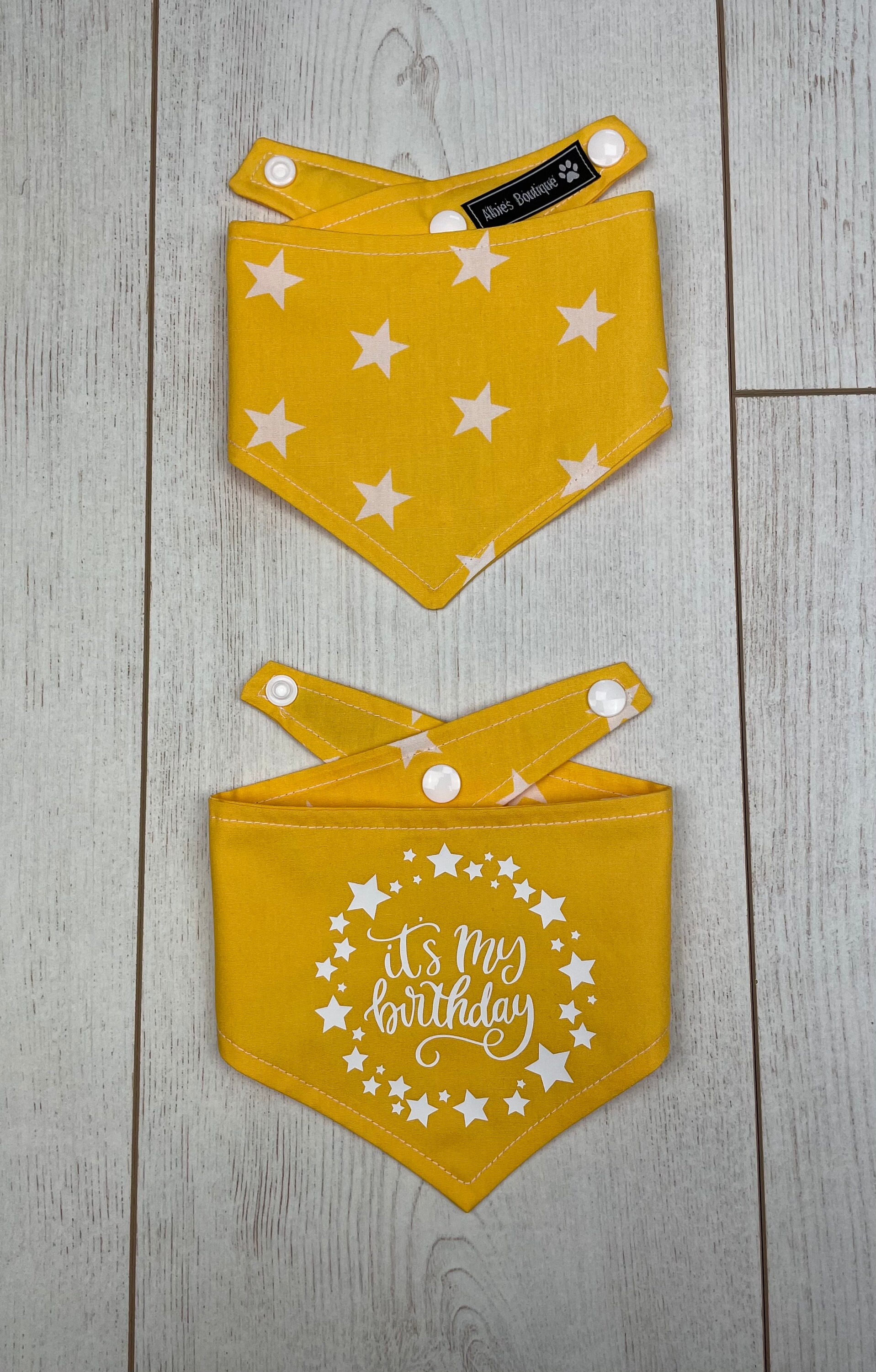 Handmade double sided dog bandana in a Bright Yellow fabric with a ‘It’s my Birthday ’ vinyl print on one side and a yellow and white Star fabric on the other. The bandana’s are secured by a popper fastening. There is an option to either add a name to the reverse or to request a change to the text on the front. This design is also available in a bright red version.